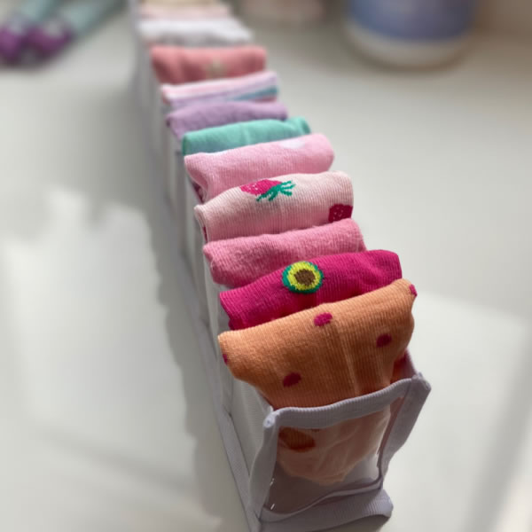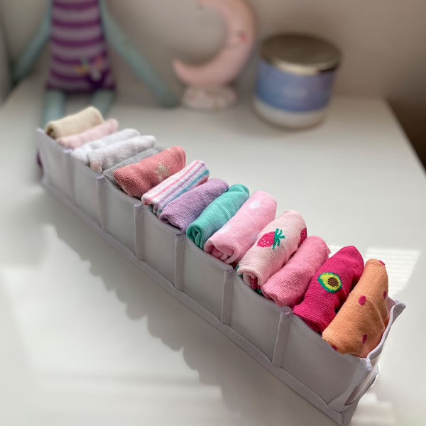 Tiene 7 compartimentos y caben hasta 20 pares de medias! Medidas: 6cm ancho x 7 cm alto x 35 cm de fondo